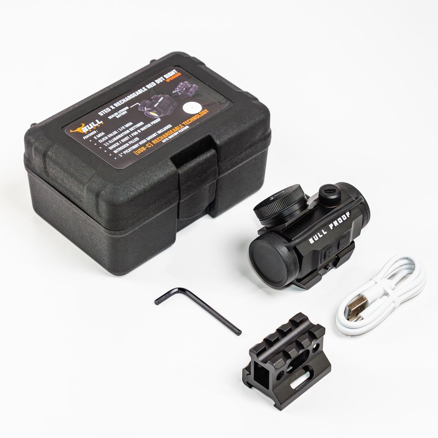 The Bull Proof Rechargeable Enclosed Red Dot Sight brings next-generation technology to everyday shooters, offering a rugged sealed design with the clarity of a crisp 2 MOA dot and precise 1/2 MOA adjustments. Its integrated USB-C rechargeable lithium battery and smart auto shut-off feature delivers unmatched convenience and reliability, eliminating the hassle of disposable batteries. With innovative engineering and modern features not seen at this price point, this red dot sets a new benchmark for practical, future-ready performance.